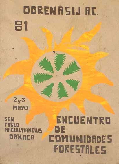 Póster de un encuentro de las Organización por la Defensa de los Recursos Naturales de la Sierra Juárez (ODRENASIJ); integrada por líderes de comunidades que lucharon por recuperar la soberanía de sus bosques. Ver más